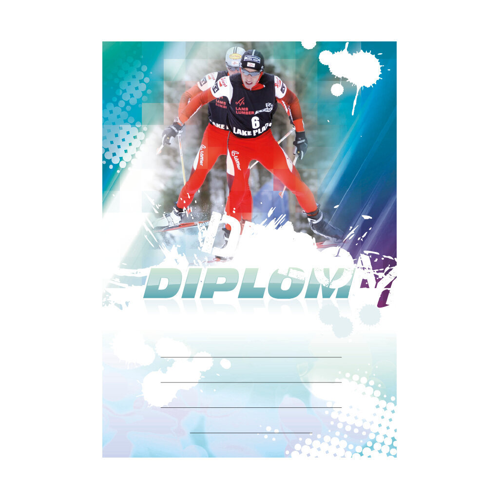 Tyrkysový diplom BEŽECKÉ LYŽOVÁNÍ 6651 s běžkaři při závodu, s polem pro 4 řádky textu a zeleným nápisem DIPLOM. Běžkařský diplom 6651 máme ve formátu A4 a A5. Papírový diplom s motivem běžeckého lyžování má gramáž 250 g/m2.