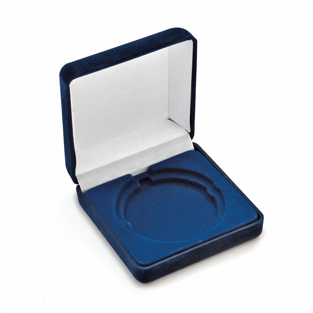 Sametová etue pro medaile o průměru 45 a 50 mm. Neprůhledná krabička má rozměr 90x90 mm s modrou sametovou vložkou, do které se vsadí medaile. Etue jsou vhodné pro pamětní medaile a pro významné sportovní či kulturní události.