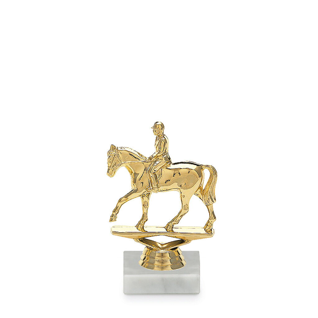 Figurka Jezdec na koni ve zlaté barvě na podstavci z bílého mramoru. Tato jezdecká trofej je vhodná pro závody v parkurovém skákání, ale využít ji lze také pro dostihové závody. Figurka jezdce na koni je vysoká 13 cm včetně podstavce. Na podstavec je možné přidat štítek s vlastním textem a nebo logem jezdeckého klubu či soutěže. Vybrat si můžete laserové štítky nebo lesklé papírové štítky. Podklady pro výrobu štítku na tuto jezdeckou trofej můžete přiložit v prvním kroku objednávky.