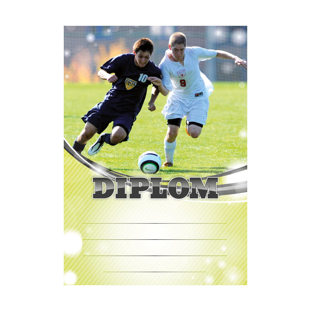 Zelený fotbalový diplom 6605 s fotbalisty v boji o míč, se zeleným polem pro 4 řádky textu a černým nápisem DIPLOM. Fotbalový diplom 6605 máme ve formátu A4 a A5. Papírový diplom má gramáž 250 g/m2.