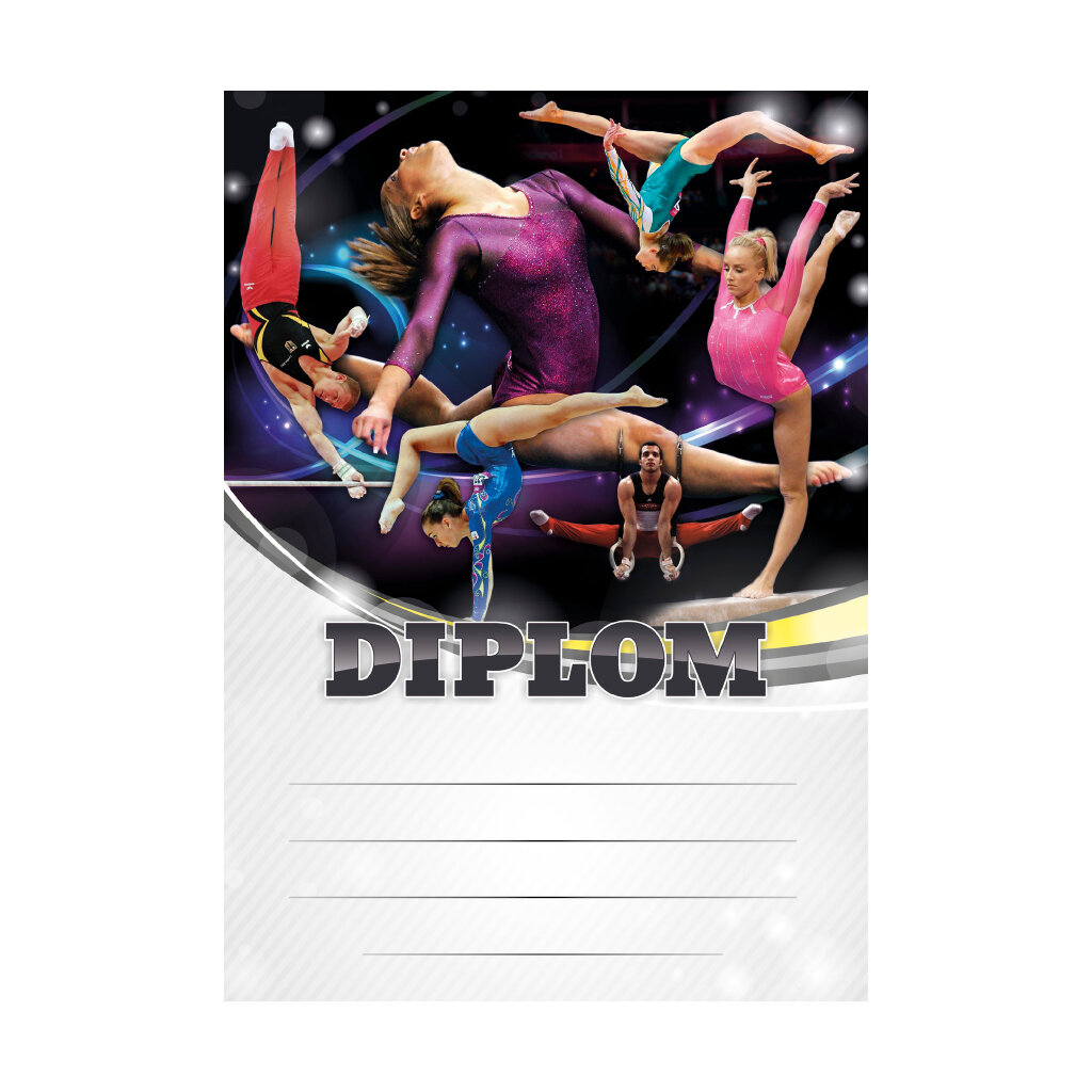 Šedý diplom GYMNASTIKA 6688 s gymnasty provádějící různé gymnastické cviky. Diplom má šedé pole pro 4 řádky textu a černý nápis DIPLOM. Gymnastický diplom 6688 máme ve formátu A4 a A5. Papírový diplom s motivem gymnastických soutěží má gramáž 250 g/m2.