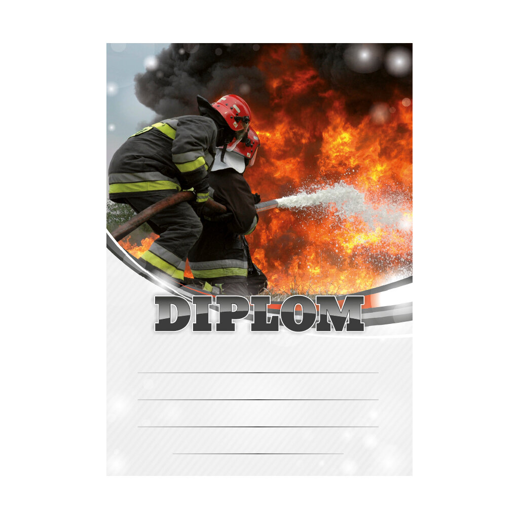 Šedý diplom HASIČI 6674 s hasiči bojujícími s obrovským požárem, s šedým polem pro 4 řádky textu a černým nápisem DIPLOM. Hasičský diplom 6674 máme ve formátu A4 a A5. Papírový diplom s motivem hašení požáru má gramáž 250 g/m2.