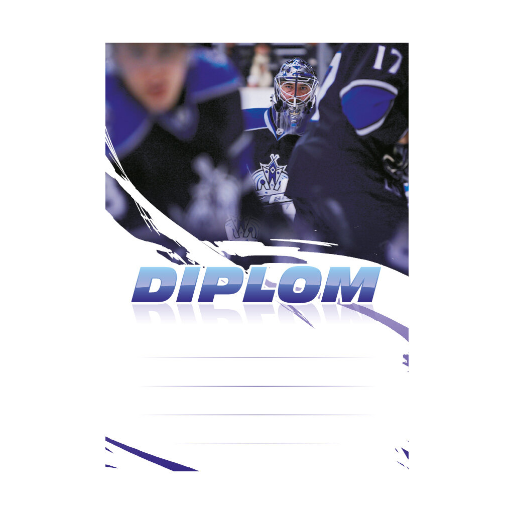 Hokejový diplom 6610 s hokejisty v černých dresech a brankářem v pozadí, s polem pro 4 řádky textu a modrým nápisem DIPLOM. Hokejový diplom 6610 máme ve formátu A4 a A5. Gramáž papírového diplomu je 250 g/m2.