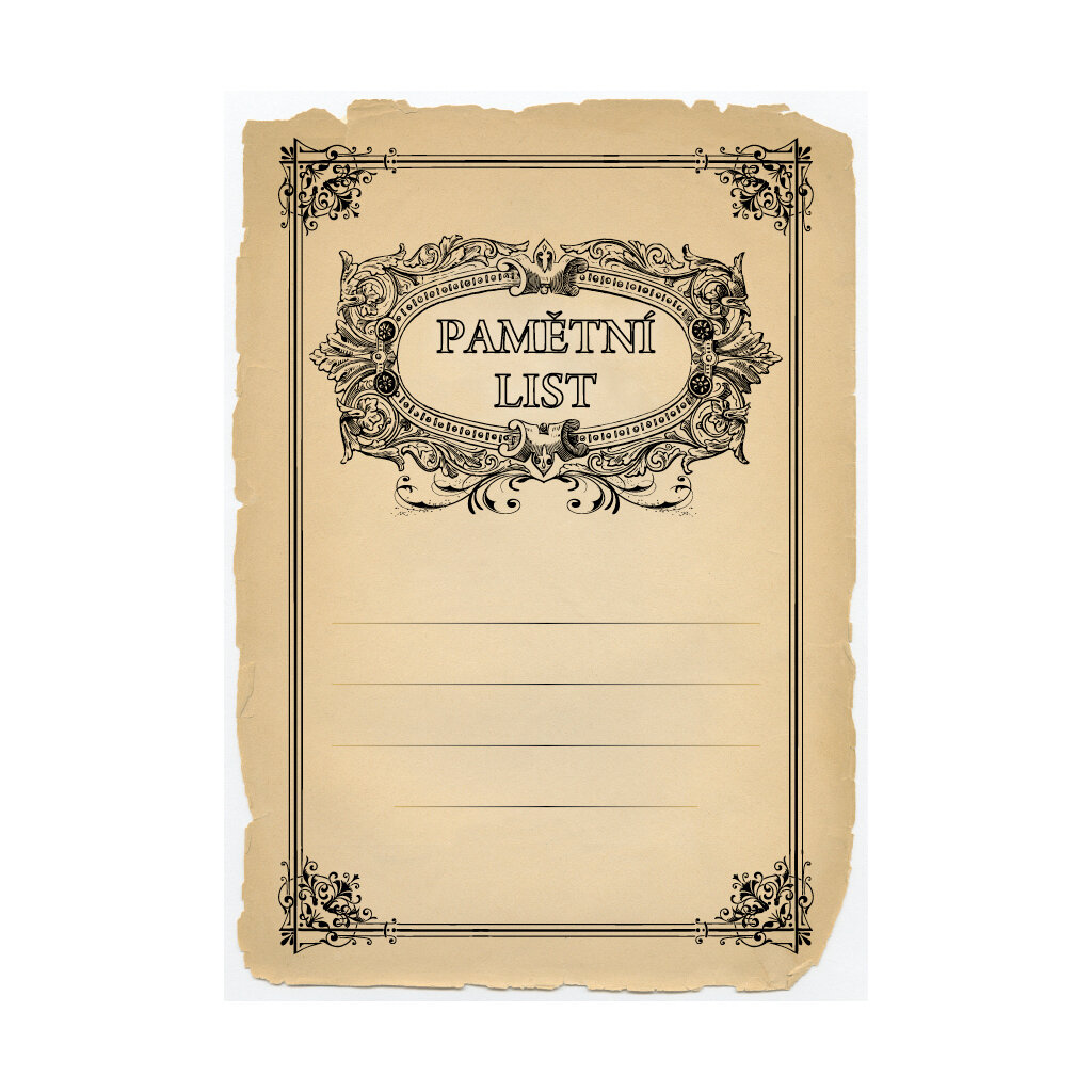 Univerzální pamětní list 6705 ve vintage stylu - zažloutlý pergamen s černým zdobným rámečkem. Pamětní list má pole pro 4 řádky textu a černý nápis PAMĚTNÍ LIST v černém zdobeném oválném rámečku. Hodí se tak především jako upomínka různých událostí. Pamětní list 6705 máme ve formátu A4 a A5. Papírový pamětní list ve starobylém stylu má gramáž 250 g/m2.