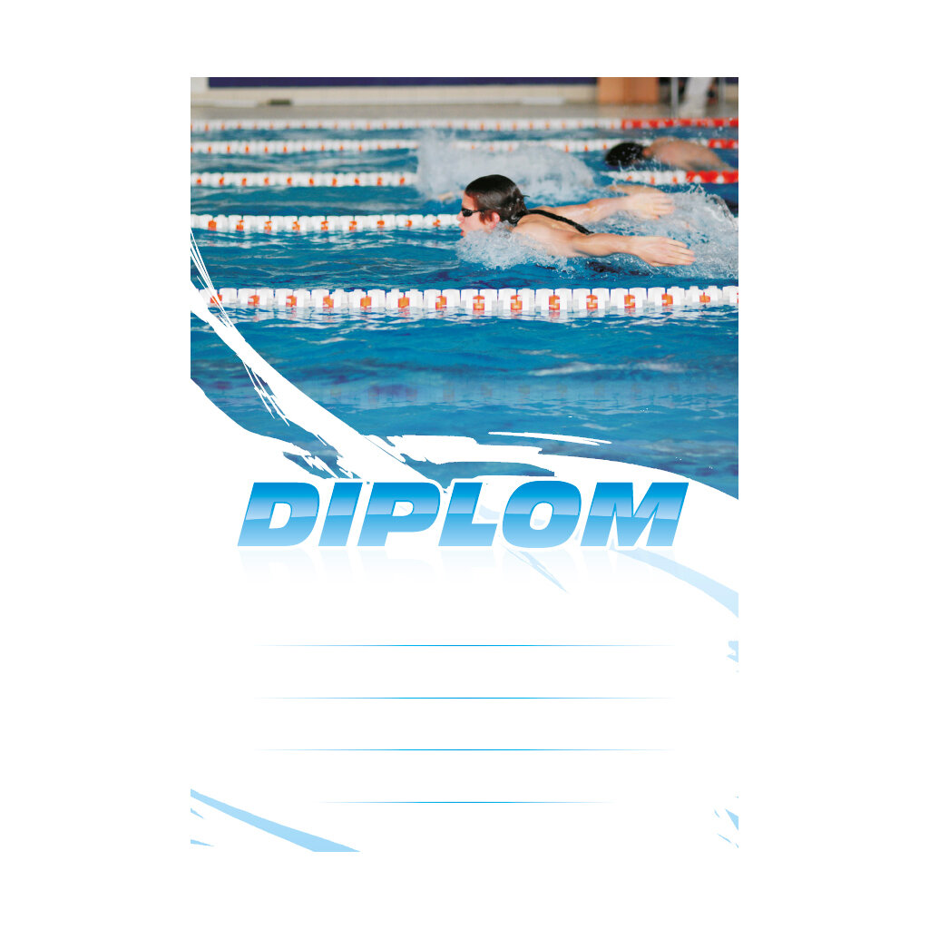 Modrý diplom PLAVÁNÍ 6655 s plavci při stylu zvaném motýlek, s polem pro 4 řádky textu a modrým nápisem DIPLOM. Plavecký diplom 6655 máme ve formátu A4 a A5. Papírový diplom s motivem plavání má gramáž 250 g/m2.