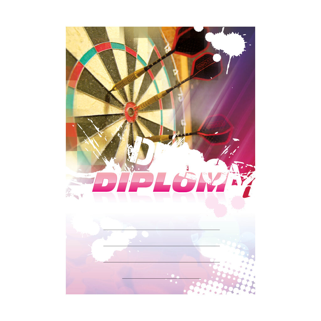 Růžový diplom ŠIPKY 6679 s detailem šipek v šipkařském terči, s polem pro 4 řádky textu a růžovým nápisem DIPLOM. Šipkařský diplom 6679 máme ve formátu A4 a A5. Papírový diplom s motivem šipek má gramáž 250 g/m2.