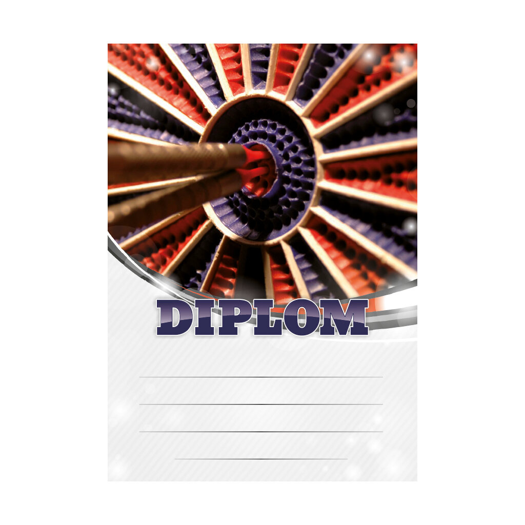 Papírový diplom ŠIPKY 6677 s detailem šipkařského terče, s šedým polem pro 4 řádky textu a temně fialovým nápisem DIPLOM. Šipkařský diplom 6677 máme ve formátu A4 a A5. Papírový diplom s motivem šipek má gramáž 250 g/m2.